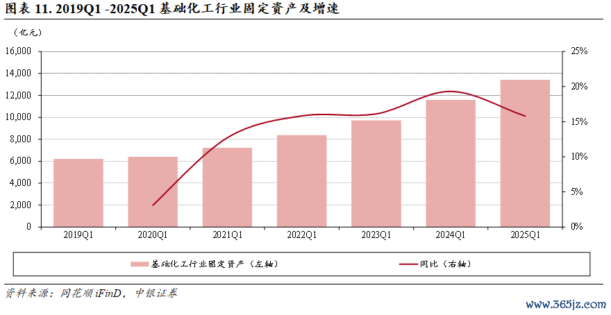 2025年一季度末基础化工行业固定资产总额为13,427.60亿元,同比增长15.81%,增幅较2024年一季度末(19.32%)有所降低。