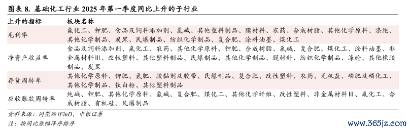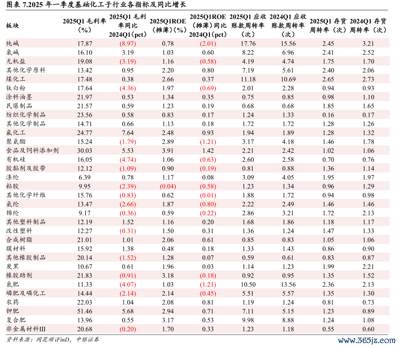 从变化来看,有17个子行业2025Q1毛利率同比提升,其中氟化工板块同比提升幅度为7.64pct,居各子行业前列;有16个子行业2025Q1毛利率同比下降,其中纯碱板块同比下滑幅度最大,为8.97pct。2025年一季度ROE(摊薄)相较于2024Q1实现增长的子行业有20个,其中食品及饲料添加剂板块的ROE(摊薄)提升最为明显,同比提升1.42pct。2025Q1毛利率、ROE(摊薄)、应收账款周转率、存货周转率同比均有所改善的子行业包括钾肥、其他化学原料、民爆制品、复合肥。
