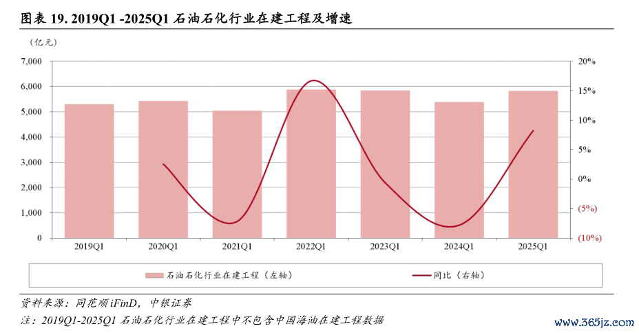 2025年一季度基础化工行业盈利能力同比有所恢复,行业在建工程近5年首次出现负增长;石油石化行业盈利能力保持稳健。