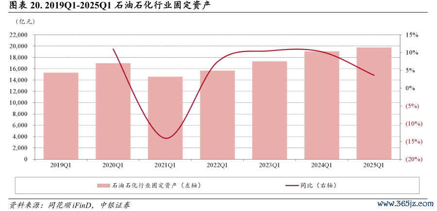 全行业固定资产持续增加。截至2025年一季度末,石油石化行业固定资产19,764.88亿元,同比增长3.61%,增长幅度较2024年一季度末10.21%有所下降。