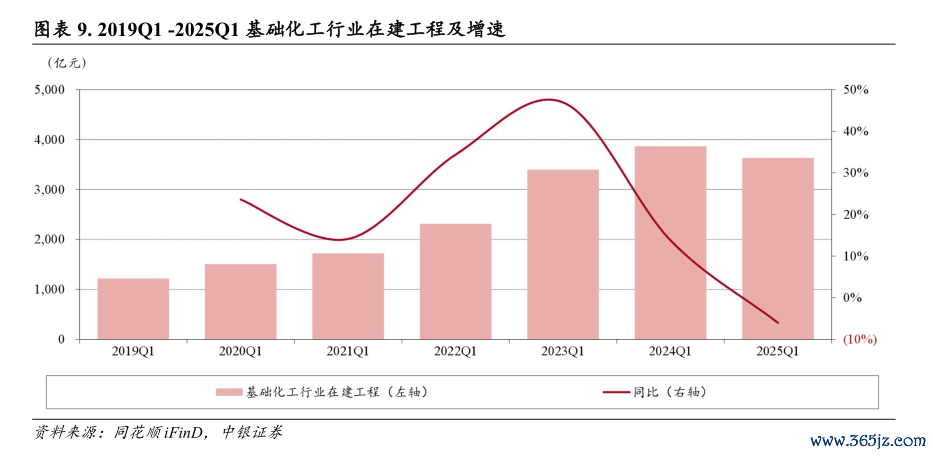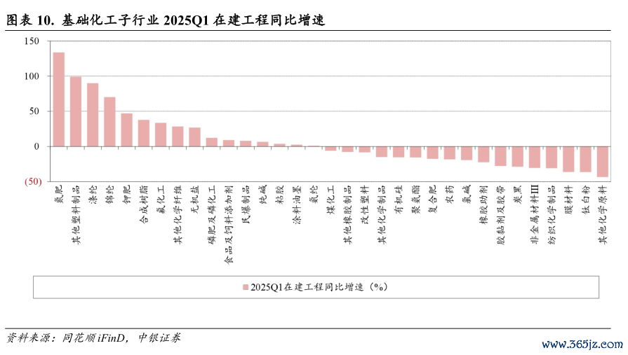 分子行业看,33个子行业中,2025年一季度末在建工程同比上升的子行业有16个,其中氮肥、其他塑料制品、涤纶、锦纶、钾肥子行业在建工程同比增速居前,分别为133.62%、99.11%、90.02%、70.26%、47.01%;2025年一季度末在建工程同比下降的子行业有17个,其中其他化学原料、钛白粉、膜材料、纺织化学制品、非金属材料子行业在建工程同比降幅居前,下降幅度分别为43.56%、36.40%、36.29%、30.95%、30.54%。